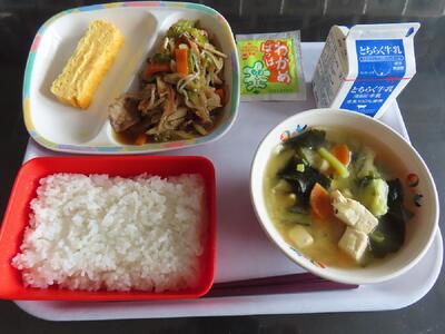 20日(月)本日の給食の献立は、ごはん、ぎゅうにゅう、あつやきたまご、ぶたにくとごぼうのいために、ぐだくさんみそしる、ふりかけです。給食では、たくさんの野菜が入ったメニューが多くあります。とてもありがたいなと思います。今日も一口一口味わっていただきます。