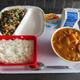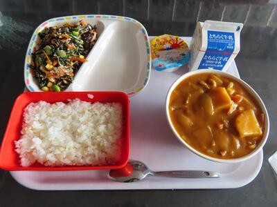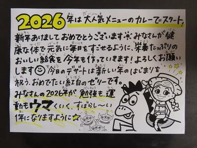 むぎごはん、ぎゅうにゅう、チキンカレー、ひじきのサラダ、うま年こうはくゼリーです。