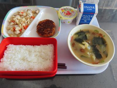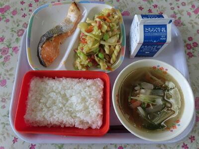 本日の給食のメニューは、ご飯、牛乳、鮭の西京味噌漬け焼き、和風マカロニサラダ、沢煮椀です。しっかり食べて、元気な体を作りましょう。