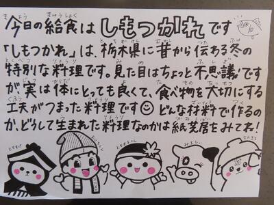しもつかれを楽しみにしていました。こどもたちは、しもつかれのいわれなどを説明した紙芝居動画を各学級で視聴します。給食で郷土料理を学習することもとても大切だと思います。