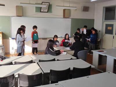 子供たちは、一人用のマイクを使い、正しい発音で言えてるか確認をしたり、翻訳機で正しい発音を聴いたりして発表の練習を行いました。一人一人それぞれが英語に向き合う時間となりました。
