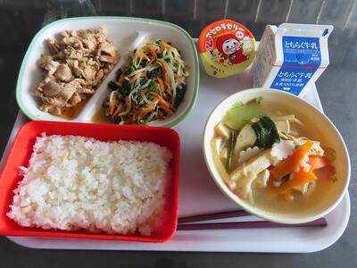 9日(木)今年度初の給食の献立は、むぎごはん、ぎゅうにゅう、ビビンバ(焼き肉、ナムル)、茎わかめスープ、アセロラゼリーです。
