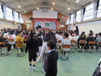 また、市会計年度任用職員の離任式を行いました。本校では一人の職員が退職となり、1年生の代表者が感謝の手紙を読んだり感謝の手紙を手渡したりしました。その後は、全員でお見送りをしました。