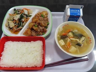 10日(金)給食の献立は、ごはん、牛乳、揚げじゃが芋ののそぼろ煮、おひたし、大根のみそ汁です。
