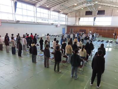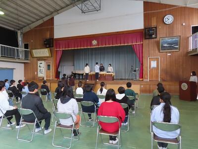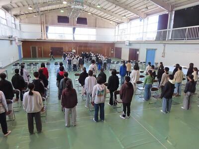 体育館では、5年生と6年生が卒業式のための校歌や呼びかけの練習をしていました。