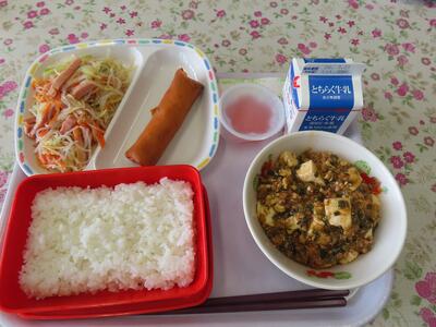 10日(火)給食の献立は、ごはん、ぎゅうにゅう、はるまき、はるさめサラダ、マーボーどうふ、ミニピーチゼリーです。