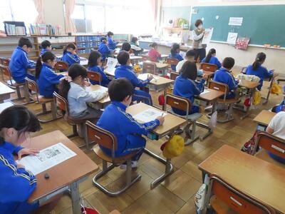6年1組は、国語科の授業で最後の追い込みをしていました。栃木県出身の立松和平さんの『海の命』を読み解いていました。