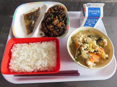 4日(木)給食の献立は、むぎごはん、ぎゅうにゅう、ホッケのしおやき、ひじきのいために、てづくりとりちゃんこじるです。