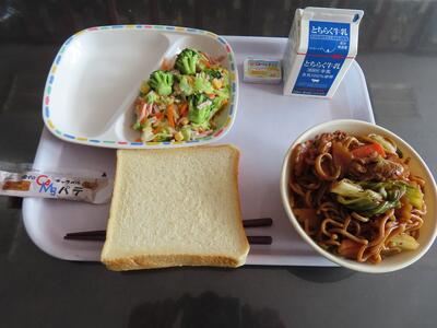 19日(水)給食の献立は、しょくパン、ぎゅうにゅう、やきそば、コールスローサラダ、チーズ、キャラメルクリームです。