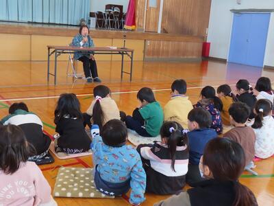 対象は、1、2年生でした。お話の題名は「蜘蛛の綾織」「十二支の話」「城鍬舞」「鳥のみじいさん」の4話でした。子供たちは、民話の会の方々のあたたかな語り部に、自然とひきこまれ夢中になってお話を聴いていました。民話の会の皆様、ありがとうございました。