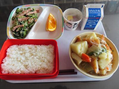 20日(木)の献立は、むぎごはん、ぎゅうにゅう、なっとう、ごまじゃこサラダ、とりしおにくじゃが、オレンジです。