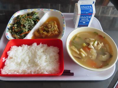 13日(木)給食の献立は、ごはん、ぎゅうにゅう、モロのねぎソースかけ、ほうれんそうののりあえ、かみなりじるです。