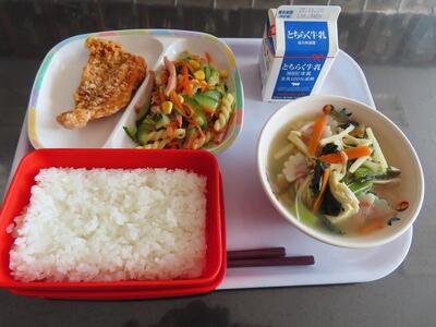 17日(月)給食の献立は、ごはん、ぎゅうにゅう、とりにくのからあげ、わふうサラダ、くきわかめスープです。