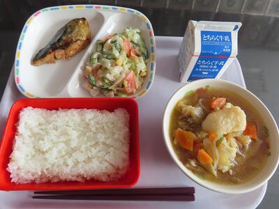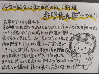 18日(火)給食の献立は、ごはん、ぎゅうにゅう、アジのピリからやき、れんこんサラダ、きりたんぽじるです。