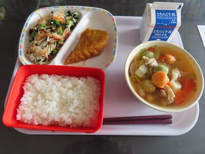 24日(火)給食の献立は、ごはん、ぎゅうにゅう、モロのみそがらめ、そくせきづけ、、鉢伏汁(はちぶせじる)です。
