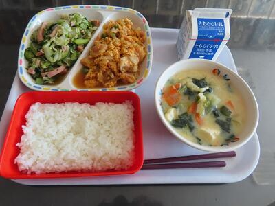 本日の給食の献立 投稿: 校長 (12:39) 24日(金)本日の給食の献立は、ごはん、ぎゅうにゅう、とりにくとたまごのおやこに、ごまじゃこサラダ、まろやかとうにゅうみそしるです。ごまじゃこサラダは、とてもおいしく特に職員の間では、ヒットメニューの一つです。