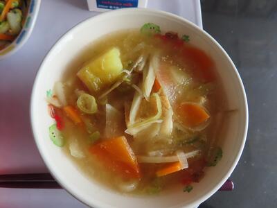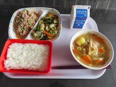 本日の給食の献立 投稿: 校長 (11:54) 2日(火)給食の献立は、ごはん、ぎゅうにゅう、そぼろどんのぐ、そくせきづけ、こんさいのごまじるです。 今日の根菜のごまじるには、4種類の根菜が入っています。子どもたちが家に帰ったら、どんな根菜が入っていたかぜひ聞いてみてください。覚えていたらうれしいですが……