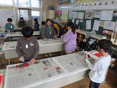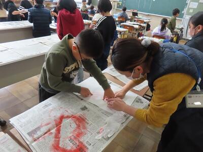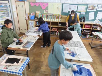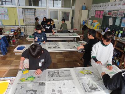 紙版画の刷り 投稿: 校長 (13:57) 11日(木)3年生は、紙版画の完成を目指し、「刷り」を頑張っていました。 慣れない手つきながら、慎重にローラーのインクを作品に付け印刷できているかを確かめていました。 きれいに印刷できたときのほっとした表情から、これまでがんばってやってきたんだなということが伝わってきました。