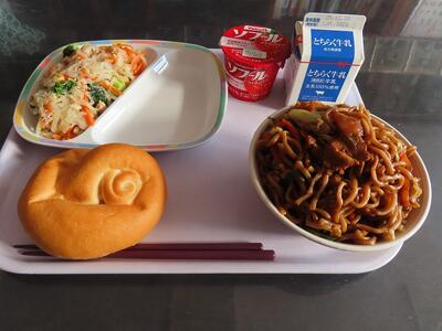 本日の給食 投稿: 校長 (11:56) 17日(水)本日の給食の献立は、こめこパン、ぎゅうにゅう、やきそば、ツナサラダ、いちごヨーグルトです。 みんな大好きな焼きそば、私もとてもとても大好きです。今日も様々に感謝していただきます!