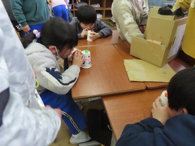 以前から自作のおもちゃを作っており、1組と2組で教室を交代しながら発表会兼実演会を行いました。