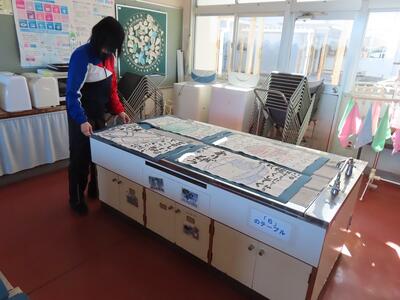 卒業式の準備 投稿: 校長 (12:00) 5日(木)卒業式の準備が着々と行われています。 6年生がかいた絵手紙が卒業式当日には、体育館に飾られます。 そのための準備が始まりました。 体育館に飾られた絵手紙をはやく見たいようなまだまだ見たくないような・・・