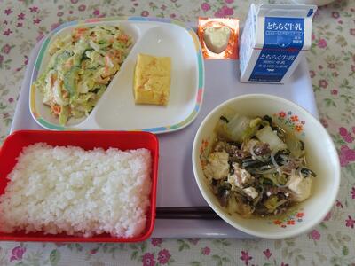 給食の献立 投稿: 校長 (11:57) 13日(金)給食の献立は、ごはん、ぎゅうにゅう、あつやきたまご、キャベツのごまマヨあえ、すきやきふうに、ディズニーチーズです。 2週間続けてきた6年生との会食も今日で最後となります。楽しく会話を楽しみながら給食をいただきます。
