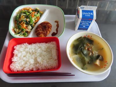 給食の献立 投稿: 校長 (11:56) 23日(木)給食の献立は、麦ごはん、牛乳、マグロカツ、菜の花あえ、なめこ汁です。 マグロカツは初めて食べるかもしれません。今から楽しみです。 今日もたくさんの人々と多くの食材に感謝していただきます。
