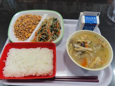 給食の献立 投稿: 校長 (11:57) 27日(月)給食の献立は、ご飯、牛乳、二食丼の具(肉そぼろ、炒り卵)、ほうれん草のごまあえ、かみなり汁です。 ~給食献立表より~ 「かみなり汁」は、雷の多い栃木県ならではの郷土料理です。豆腐をごま油で炒めるときにバリバリと雷のような音がすることからその名がつきました。給食では、いろいろな県の郷土料理を取り入れていきます。どんな料理が出るか楽しみにしていてください。